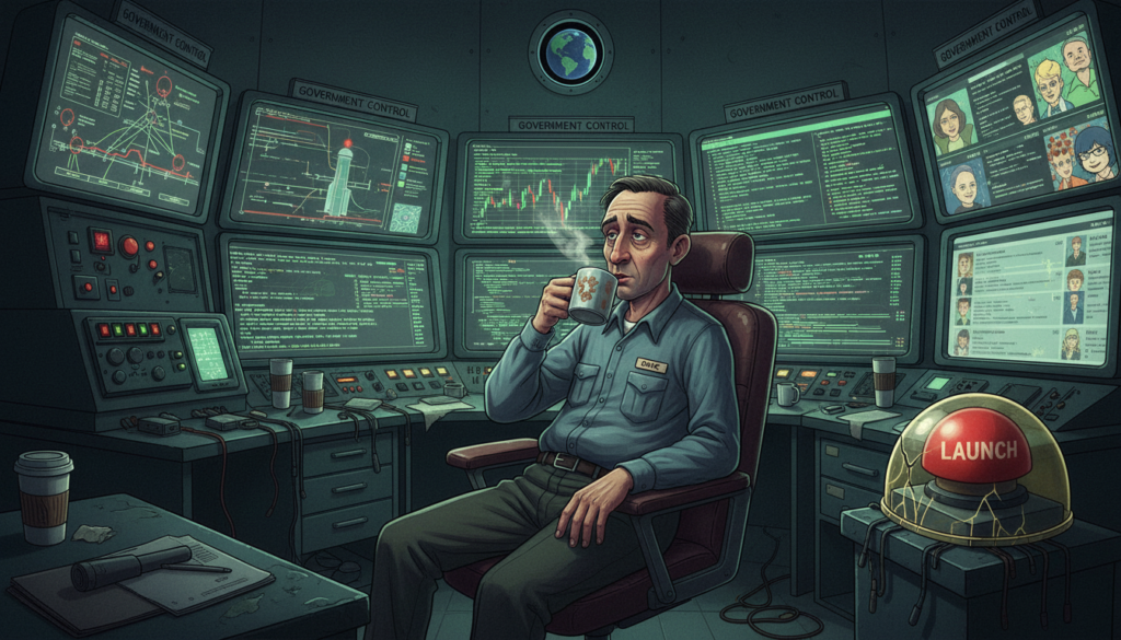 There exists, somewhere in the vast bureaucratic machinery of human civilization, a person whose job it is to ensure that nuclear weapons don’t accidentally get launched. This person, let’s call him Dave, probably has a mortgage; enjoys mediocre coffee; and occasionally forgets where they parked their car. Dave is, in other words, exactly as competent as the rest of us, which is to say: just barely enough to muddle through most days without setting anything important on fire.