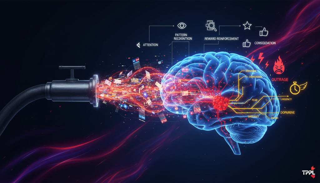The firehose doesn’t just spread lies. It triggers a four-stage cognitive hijack, a sequence that turns attention into belief.